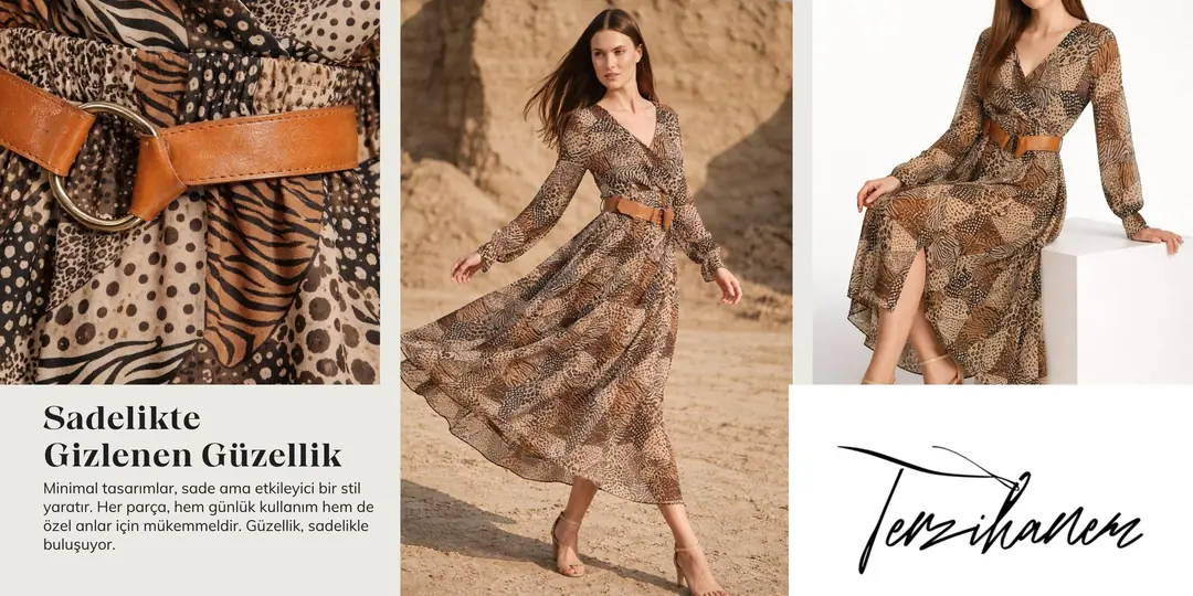 Doğanın Ritmi: Modern Kesimler ve Etnik Desenlerin BuluşmasıModa dünyasında "zamansızlık" kavramı, bazen karmaşık desenlerin en sade formlarla buluştuğu noktada gizlidir.Terzihanemolarak yeni sezon koleksiyonumuzda odak noktamıza aldığımız "Sadelikte Gizlenen Güzellik" mottosu, tam da bu dengeyi temsil ediyor.Desenlerin Gücü: Hayvan Figürlerinden Geometrik FormlaraGörseldeki elbisemiz, klasik leopar desenine modern bir yorum getiriyor. Toprak tonlarının sıcaklığını zebra çizgileri ve puantiye detaylarıyla harmanlayan bu tasarım, doğanın vahşi ama zarif ruhunu üzerinizde taşımanıza olanak tanıyor. Karmaşık görünen bu desen yapısı, şifon kumaşın hafifliğiyle birleştiğinde ortaya göz yormayan, aksine merak uyandıran bir şıklık çıkarıyor.Detaylardaki Zarafet: Deri Kemer ve Kruvaze KesimBir tasarımı "ikonik" kılan unsurlar, küçük ama etkili dokunuşlardır.